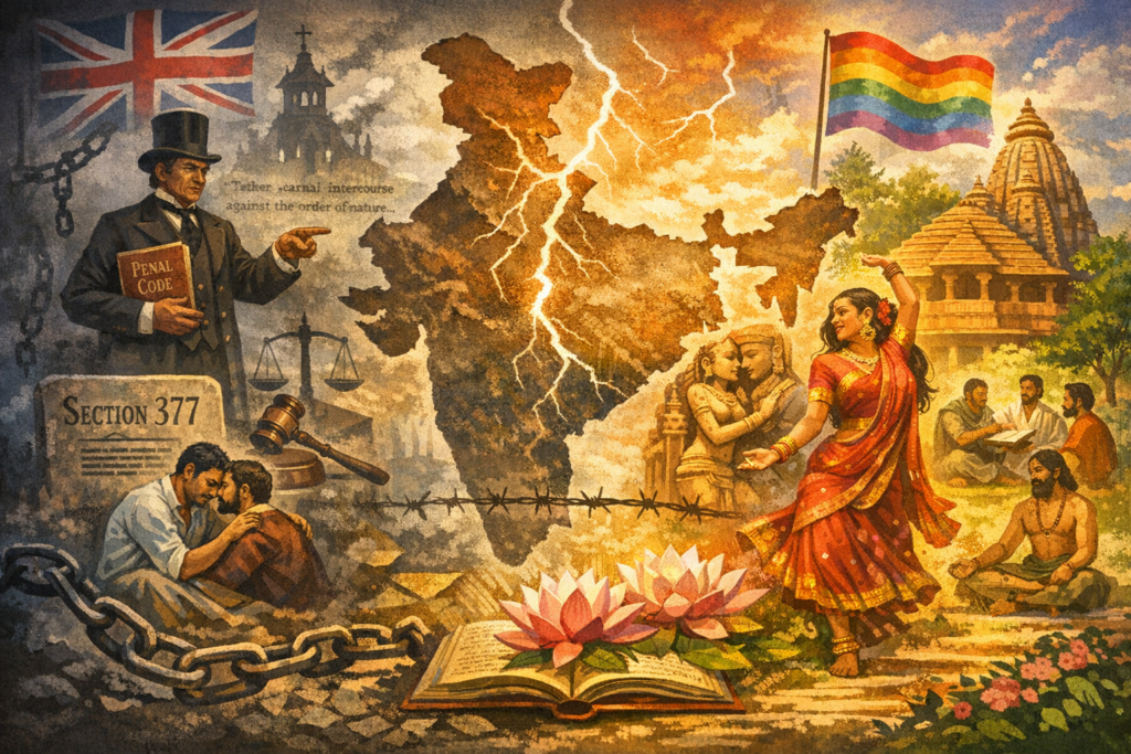 Before British arrival, Indian society exhibited a relatively tolerant stance toward diverse sexualities, influenced by ancient Hindu, Buddhist and Jain texts that portrayed homosexuality, bisexuality and gender fluidity without outright condemnation. Ethical concern focused less on the gender of one’s partner than on attachment, desire and karmic consequences of action, with sexual diversity understood as part of conditioned embodied existence rather than as moral transgression. Temple carvings at sites like Khajuraho also depict homoerotic scenes (Chakraborty & Thakurata, 2013), reflecting cultural acceptance in medieval India. The Khajuraho temples belong primarily to Hinduism, with a minority Jain presence as well.