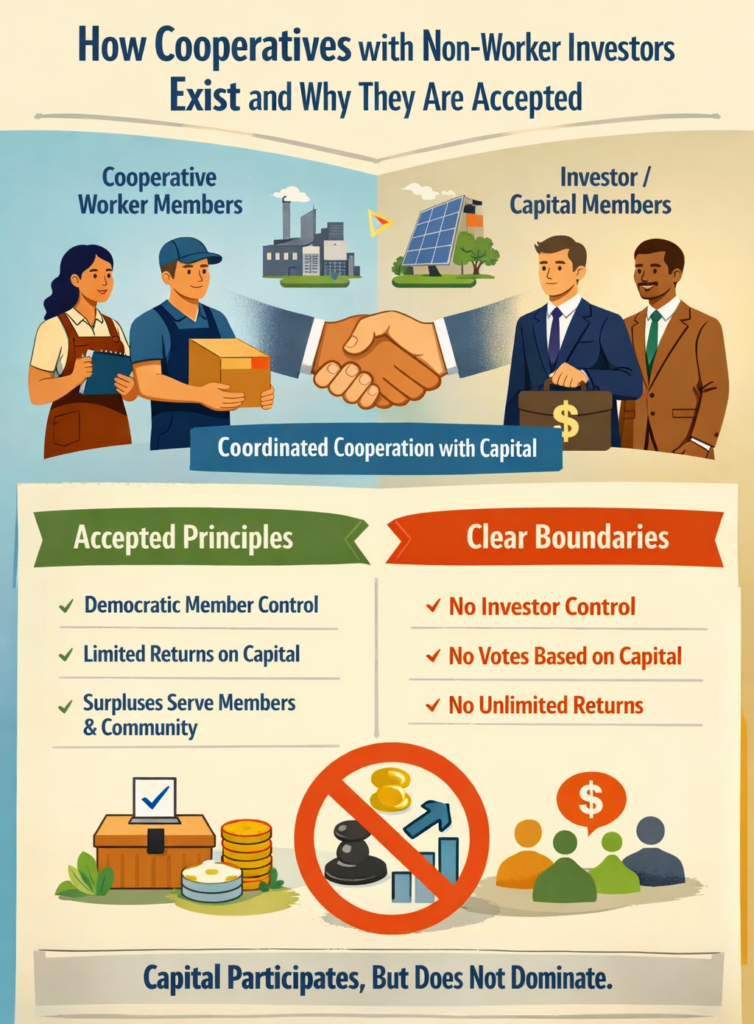 There are cooperatives that have investors who are not also workers. This is more common than many may think. Across the global cooperative movement this is normal, not heretical, provided governance remains cooperative. That is, the cooperative spirit prevails. What matters is who controls the cooperative, not who supplies capital. These investors are usually called: