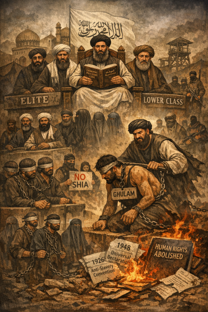 The code repeatedly uses the term ghulam (Arabic/Pashto for ‘slave’). As reported by The Diplomat and Afghan rights group Rawadari (cited in Hasht-e Subh Daily) this indicates that the code distinguishes between ‘free’ persons and ‘slaves’ in legal proceedings. This constitutes formal legal recognition of a status that modern international law has abolished and that most contemporary Islamic legal scholars regard as incompatible with present-day Islamic ethics. While the Taliban claim fidelity to Sharia ‘law’, this move effectively legitimises ownership or permanent servitude of human beings under religious authority.
