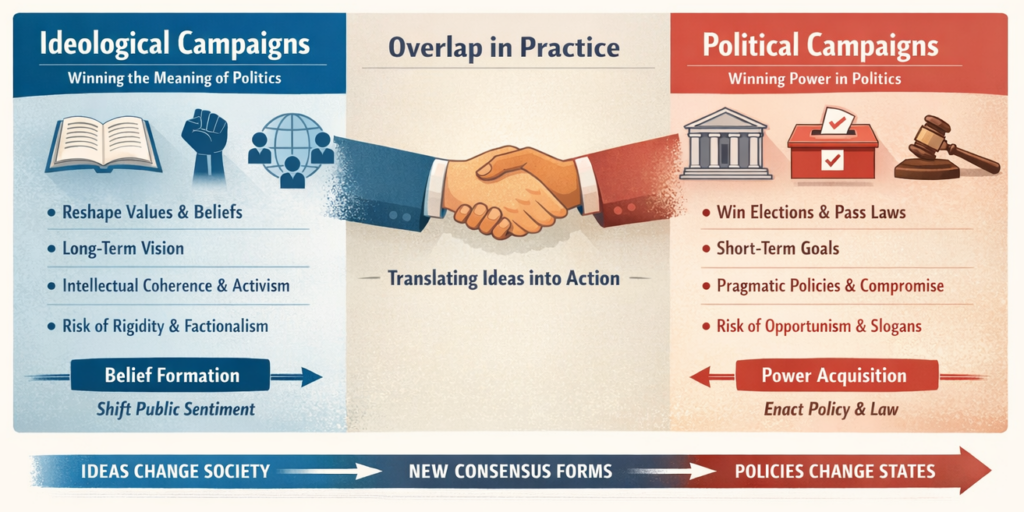 Ideological campaigns aim to win the meaning of politics. Political campaigns aim to win power inside politics. However, ideological campaigns and political campaigns do overlap in practice, but they are driven by fundamentally different logics.