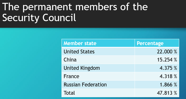 However, there is a strong argument that all permanent members of the UN Security Council should shoulder even greater financial responsibility than they currently do. Why not at least 5% each of the regular UN budget? The other permanent members of the UN Security Council already pay over or near that. The different financial contributions between the USA and Russia are currently glaringly obvious at 22% versus 2%. Wouldn’t 20% versus 5% be a better reflection of global responsibility? China pays a little over 15% and the UK and France each pay a little over 4% of the UN regular budget. Russia is way behind.