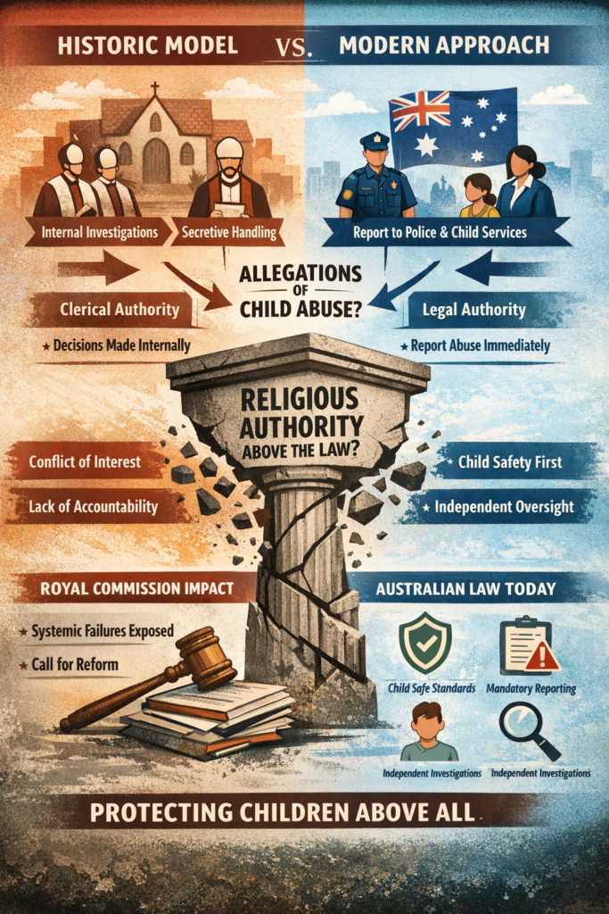 Today, the practical issue at stake is straightforward. Allegations of child sexual abuse must be reported immediately to external authorities such as police or child-protection agencies. Yet historically many religious organisations dealt with such allegations internally, relying on clergy or senior officials to investigate and determine the appropriate response. This approach is problematic because it places decisions about serious criminal conduct in the hands of individuals who may lack investigative expertise, face conflicts of interest, and operate within structures that prioritise institutional protection over the rights and safety of victims.