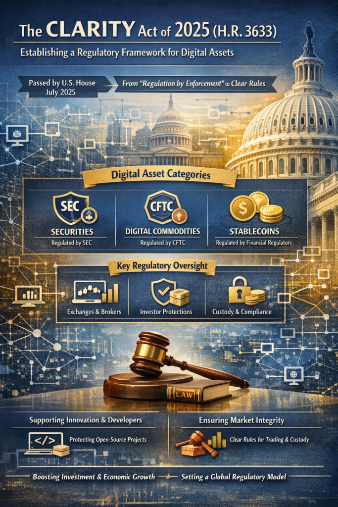 The Digital Asset Market Clarity Act of 2025 (H.R. 3633), commonly known as the CLARITY Act, represents the most significant attempt by the United States (U.S.) Congress to establish a comprehensive legal framework for digital assets. This includes cryptocurrencies, but it covers blockchain systems and distributed ledger technology (DLT) more generally. Passed by the U.S. House of Representatives in July 2025 and currently under consideration by the Senate, the Act seeks to resolve years of regulatory uncertainty that emerged as blockchain technologies expanded rapidly while federal oversight remained fragmented.